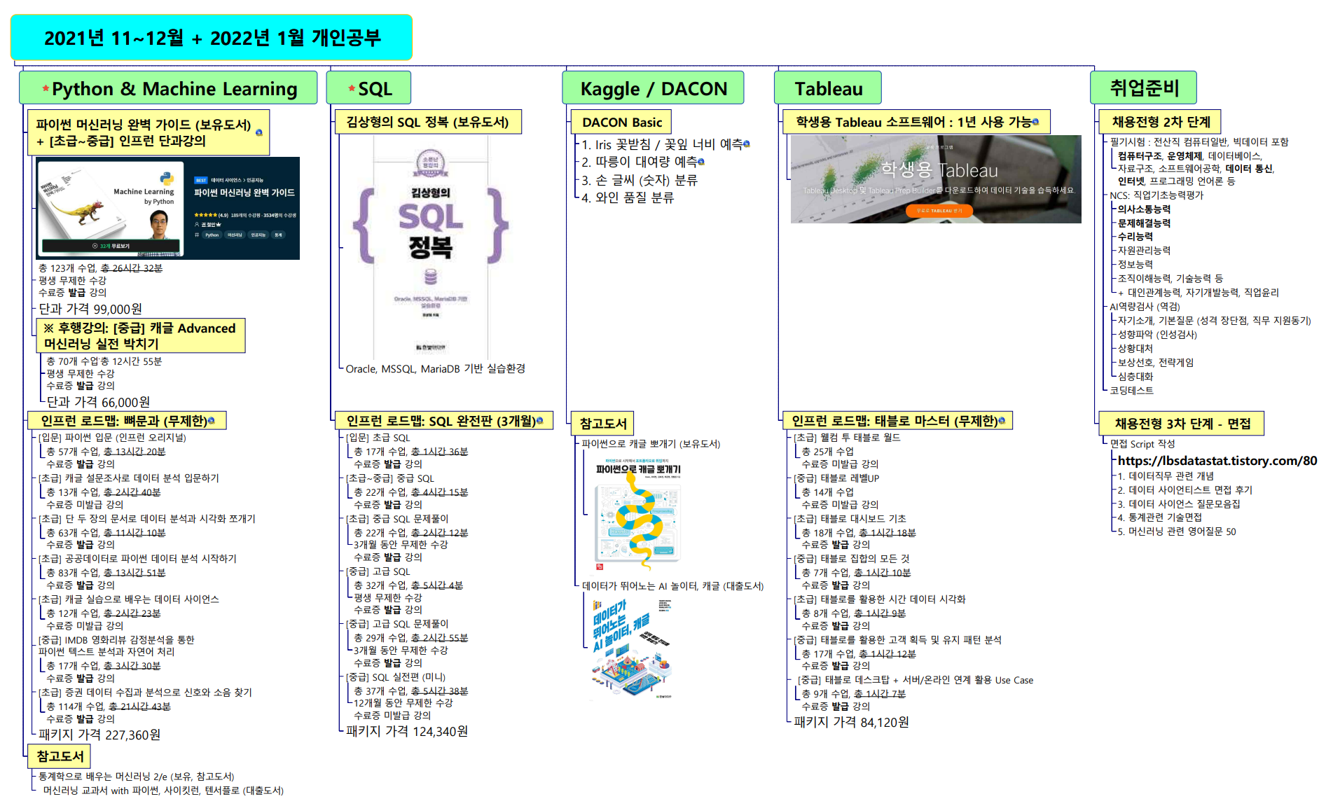 2) 추가로 개인공부 및 자기계발을 위해 캐글이나 SQL 등을 공부