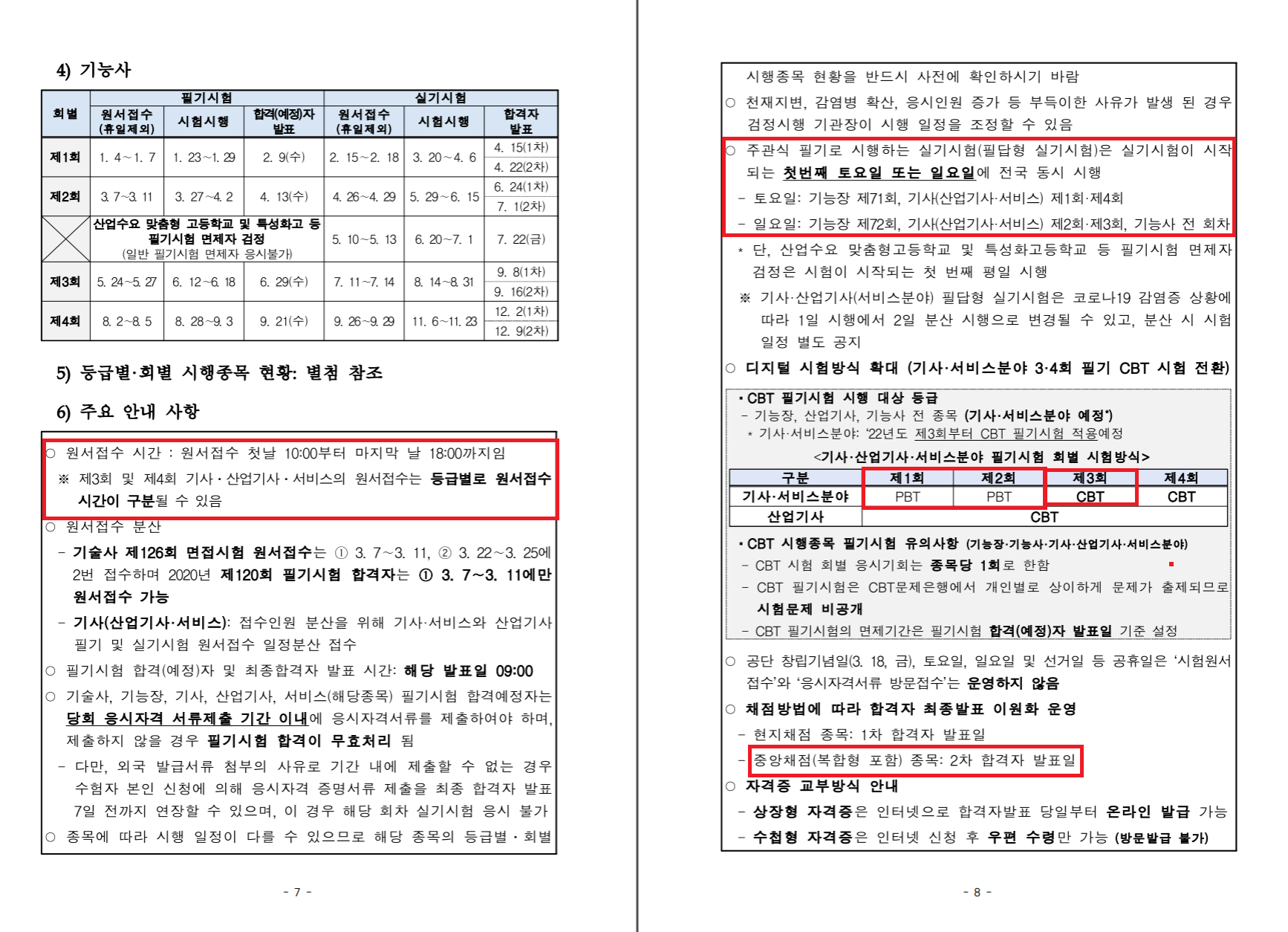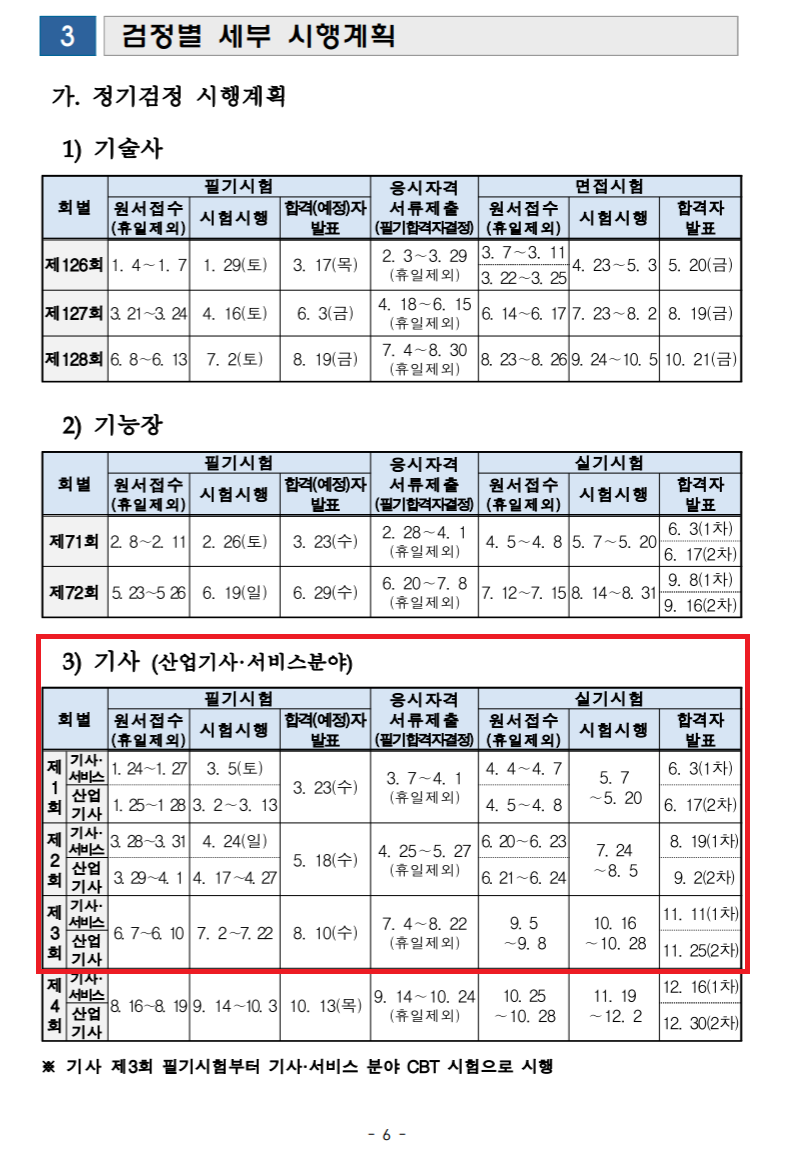 한편 기사 3회 필기시험부터는 컴퓨터 기반의 시험(CBT; Computer Based Test)으로 진행이 되기 때문에 시험이 평일에도 시행할 수 있게끔 일정이 바뀌게 됩니다. 기존 산업기사 응시하실 때와 같게 된다고 보시면 될거에요.