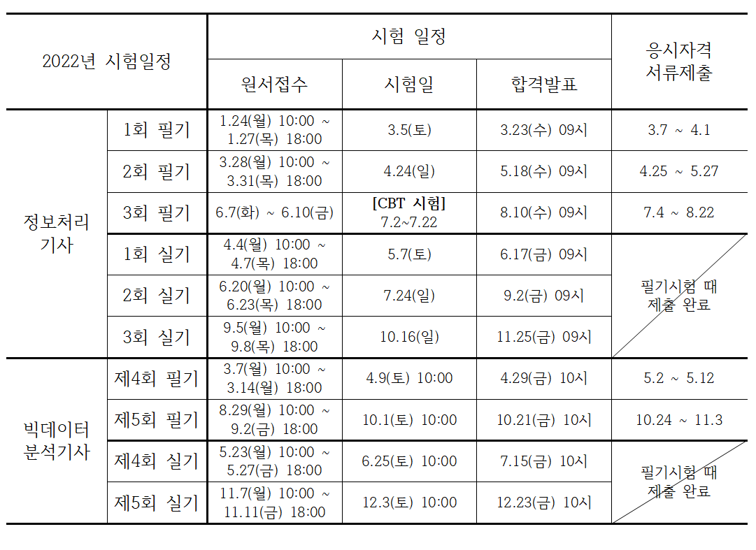 정처기와 빅분기 시험일정을 종합한 일정표는 아래에 이미지 파일로 첨부해 두도록 하겠습니다. 종목별 분류 또는 필기시험일 기준 분류로 나뉘어져 있으니 필요한 양식대로 활용해주시면 되겠습니다.