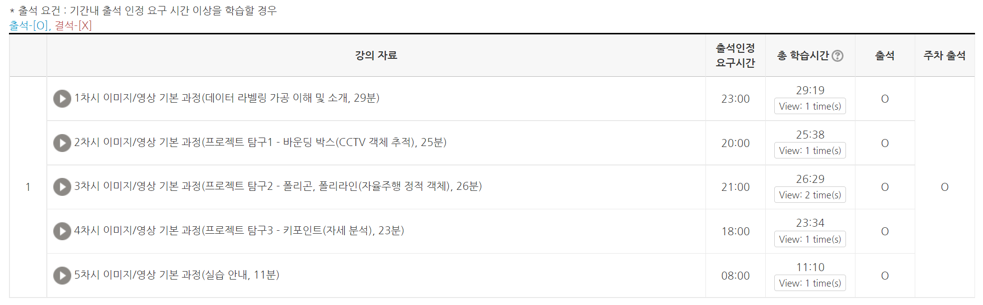 이번 이미지/영상 기본 과정은 약 115분 분량의 강의 5개를 수강하고, 실습과제를 일정 분량 제출해야 수료 처리가 됩니다. 강의의 경우 분량에 따라 최소 출석인정 요구시간을 채워주셔야 하고, 모든 강의의 최소시간을 채우게 되면 출석이 인정됩니다.