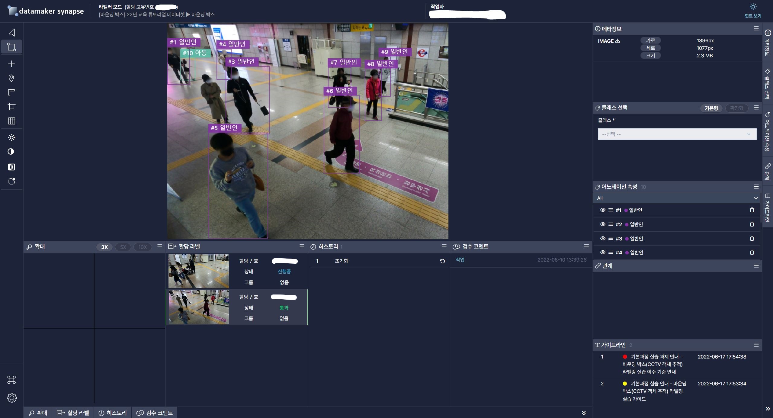 2차시는 위 사진과 같이 '바운딩 박스'를 그리는 파트였습니다. 보이는 사람에 따라 박스 표시를 하면 되는 작업이지만, 기준을 만족시키는 과정이 필요하기에 꼼꼼히 다듬어야 할 필요는 있었습니다.