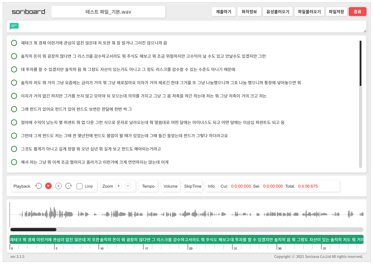 그래서 실습을 진행하게 되면, 위와 같은 형태와 같이 음성 데이터를 전사하게 됩니다. 테스트 파일은 5분 정도로 구성되어 있으며, 소리 나는 대로 한글만을 사용해서 잘 받아적는 것이 중요한 포인트라고 생각했습니다. 그래서인지 타자가 빠를수록, 다른 소리의 방해 없이 작업할 수 있는 환경인 분들에게 유리한 과정이라고 느껴졌습니다.