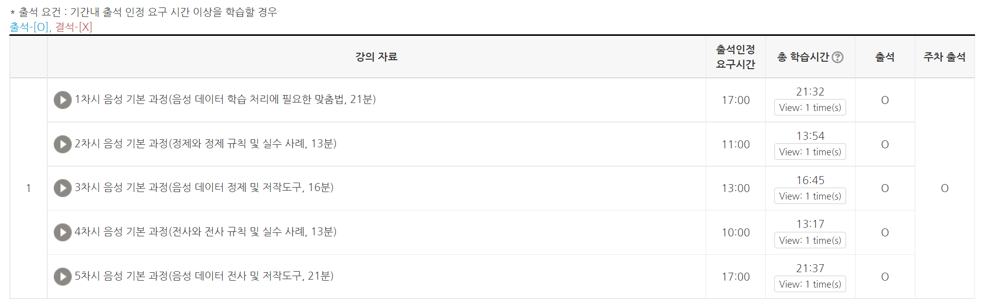 이번 음성 기본 과정은 약 95분 분량의 강의 5개를 수강하고, 실습과제를 제출해야 수료 처리가 됩니다. 강의의 경우 분량에 따라 최소 출석인정 요구시간을 채워주셔야 하고, 모든 강의의 최소시간을 채우게 되면 출석이 인정됩니다.