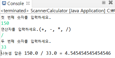 System.out.println("나눗셈 답은 " + a + " / " + b + " = " + Calculate.div(a, b));