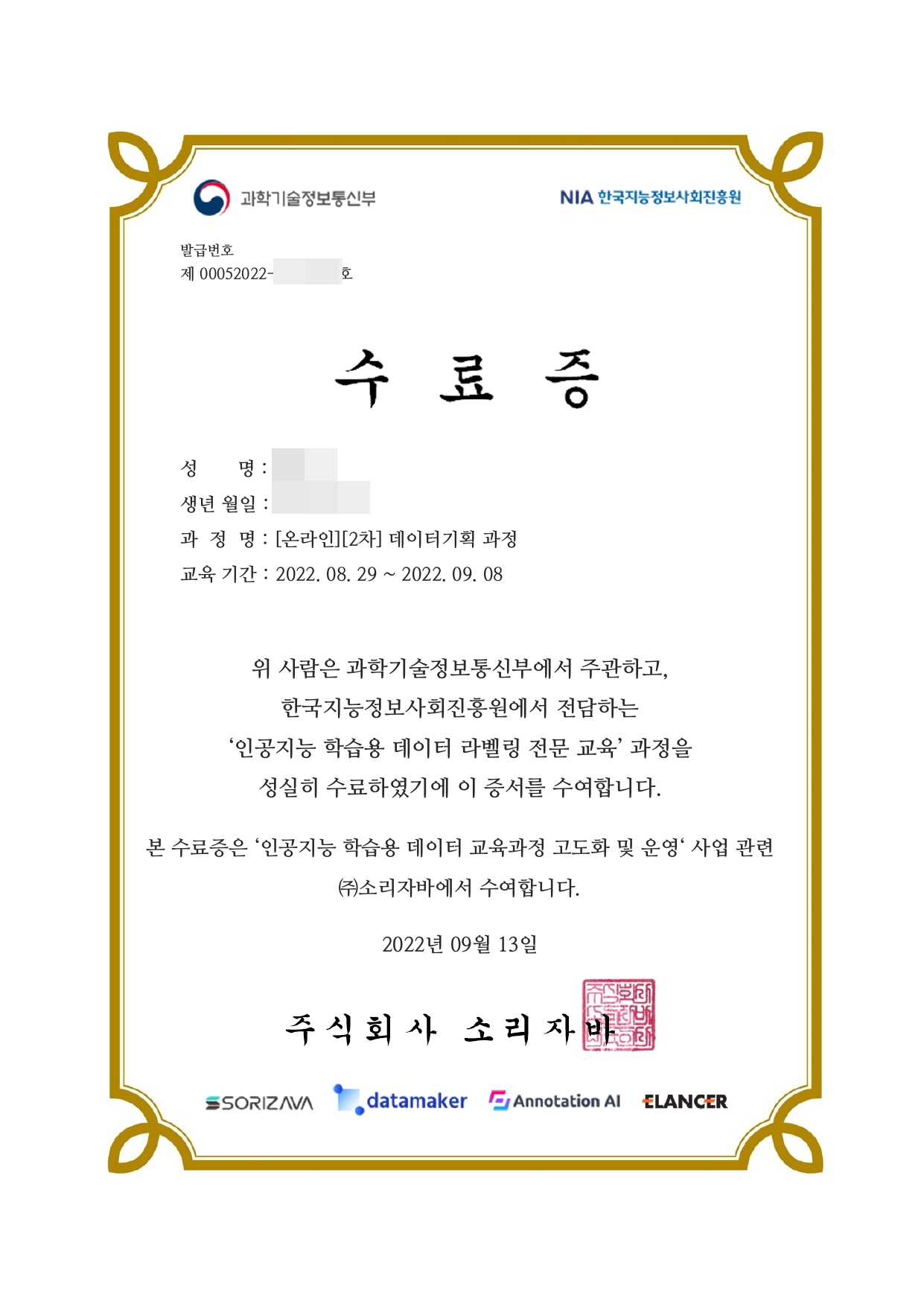 | 라벨링교육 텍스트(기본) 수강 후기 [2022년 인공지능 학습용 데이터 라벨링 전문 교육] (0) | 2022.09.09 |