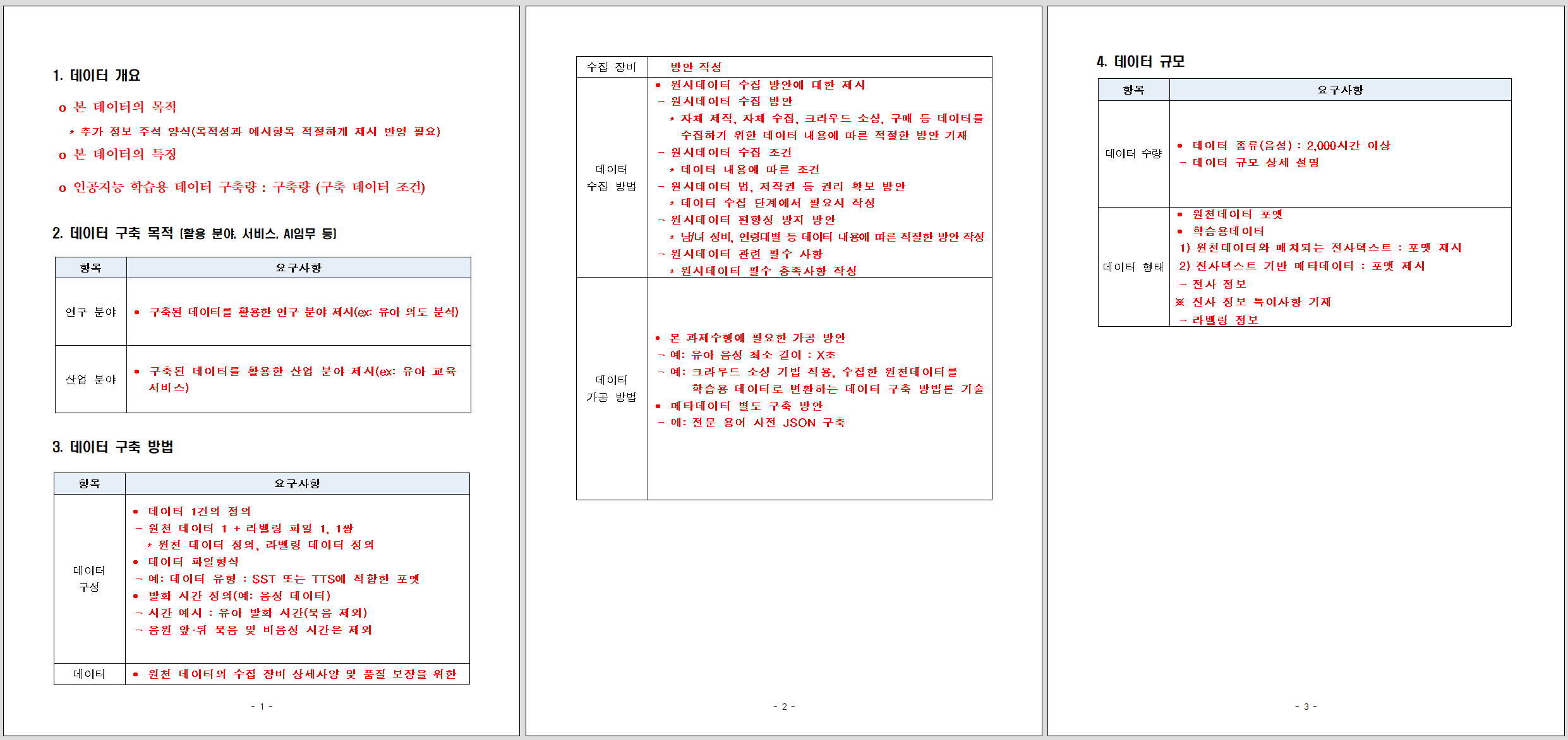 인공지능 학습용 데이터 기획을 위해 RFP를 작성해야 한다는 내용이 중점적으로 들어가 있었습니다. RFP는 Request For Proposal의 약자로 제안요청서라고 부르며, 특정 과제의 수행에 필요한 요구사항을 체계적으로 정리하여 제시함으로서 제안서를 작성하는데 도움을 주기 위한 문서라고 되어 있습니다. 추후 사용자의 제안대로 잘 실행되고 있는지 판단하기 쉽게 만들어주며, RFP가 구체적일수록 제안서의 품질이 높아지고, 프로젝트 동안 의견 충돌이나 갈등을 방지할 수 있다는 장점이 제시되었습니다.