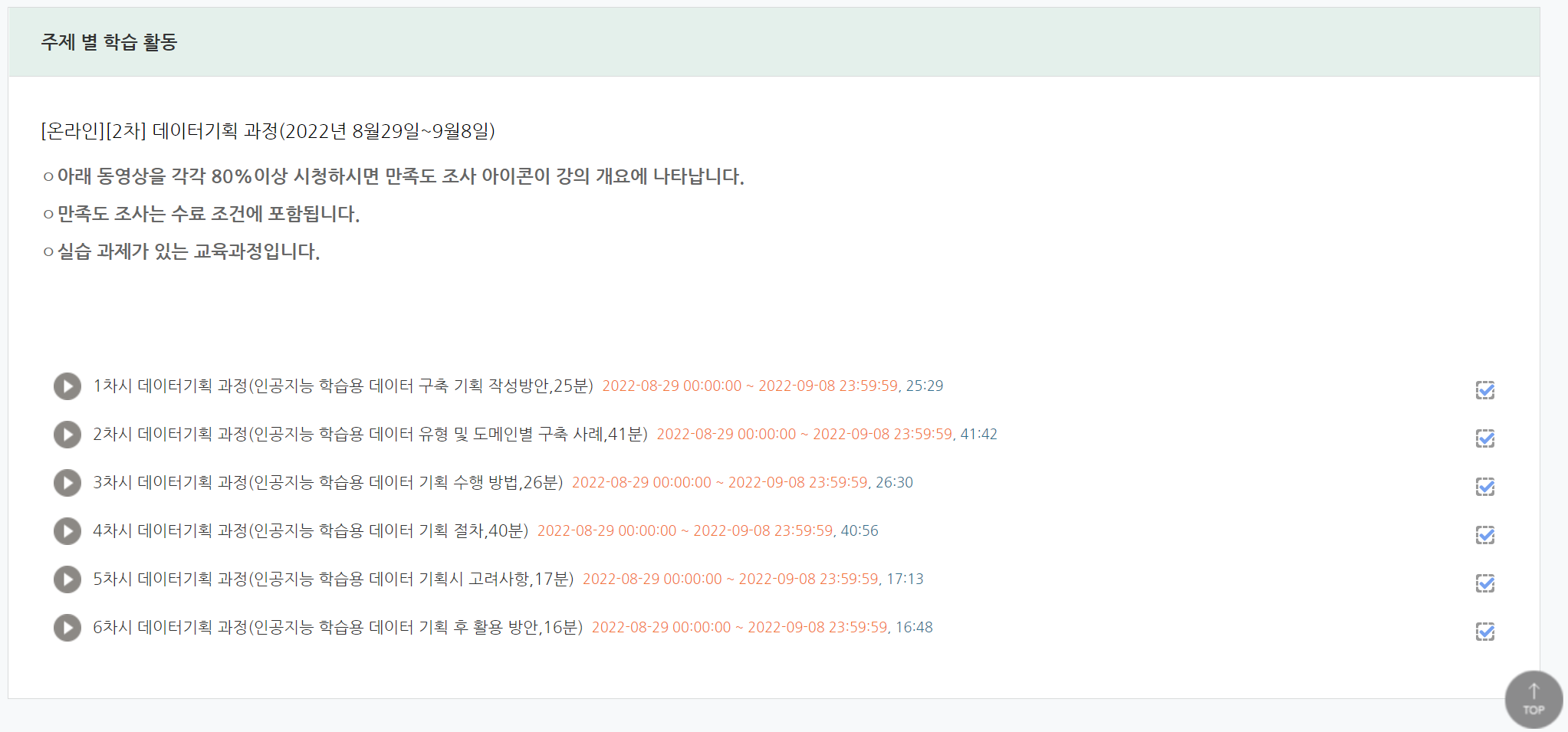 데이터 기획 과정은 약 200분 분량의 강의 6개를 수강하시고, 실습 과제에서 80점이 넘는 점수를 얻어야 수료 인정을 받으실 수 있습니다. 물론 수료증 발급을 위해서는 '인공지능 윤리와 법'이라는 필수 과정을 반드시 이수해주셔야 합니다.