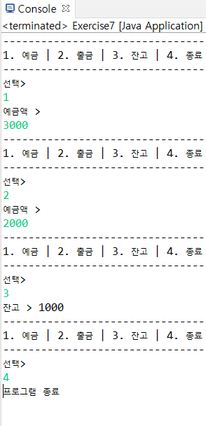 7. while문과 Scanner를 이용하여 예금, 출금, 조회, 종료 기능을 제공하는 코드 작성