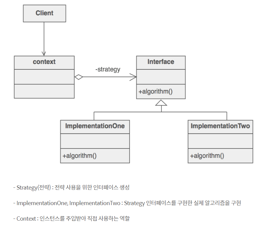 Java의 디자인 패턴 - 전략 패턴: 각각의 알고리즘군을 교환이 가능하도록 별도로 정의하고 각각 캡슐화한 후 서로 교환해서 사용할 수 있는 패턴이다. 즉, 프로젝트 전체에서 변경이 일어나지 않는 부분에서 변경이 일어나는 부분을 찾아서 따로 캡슐화하는 것이다.