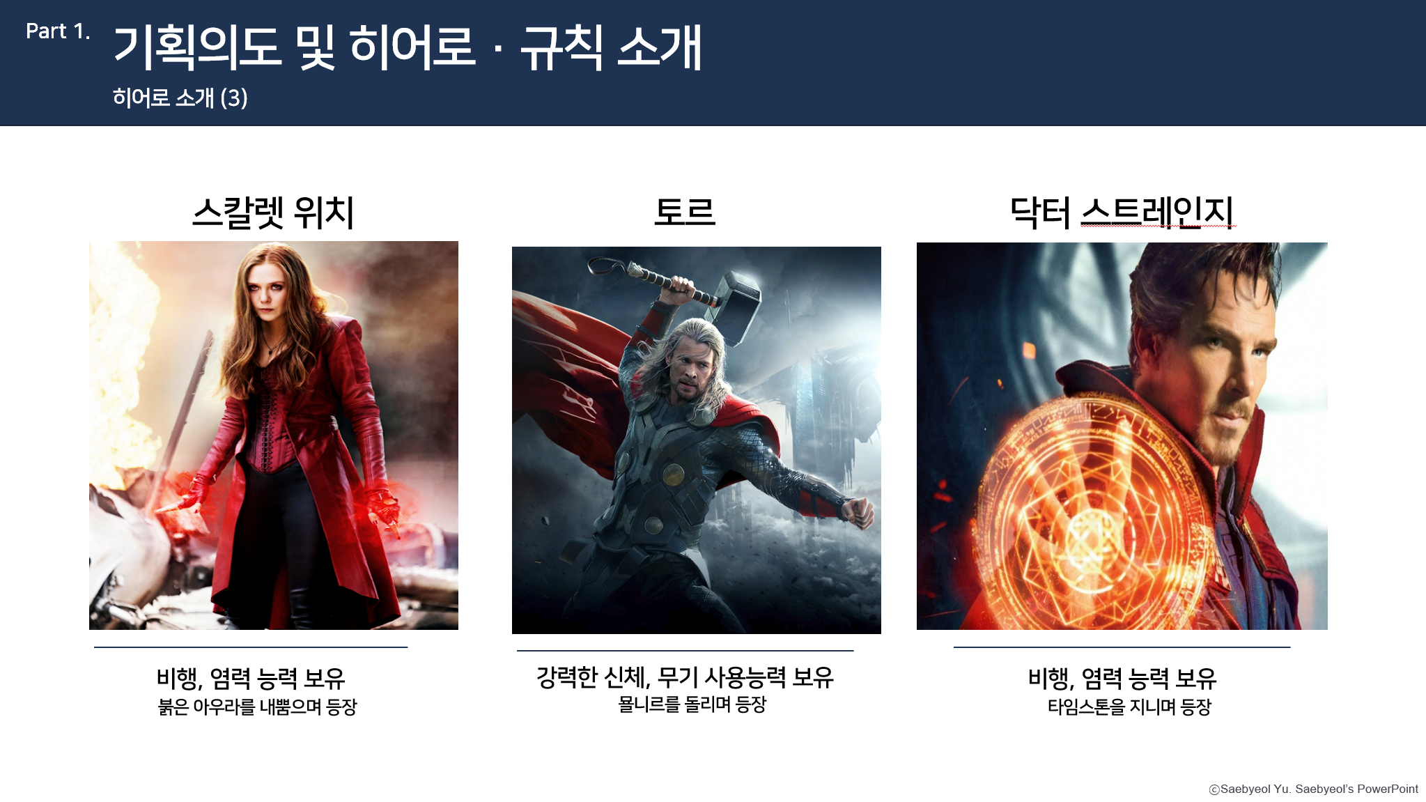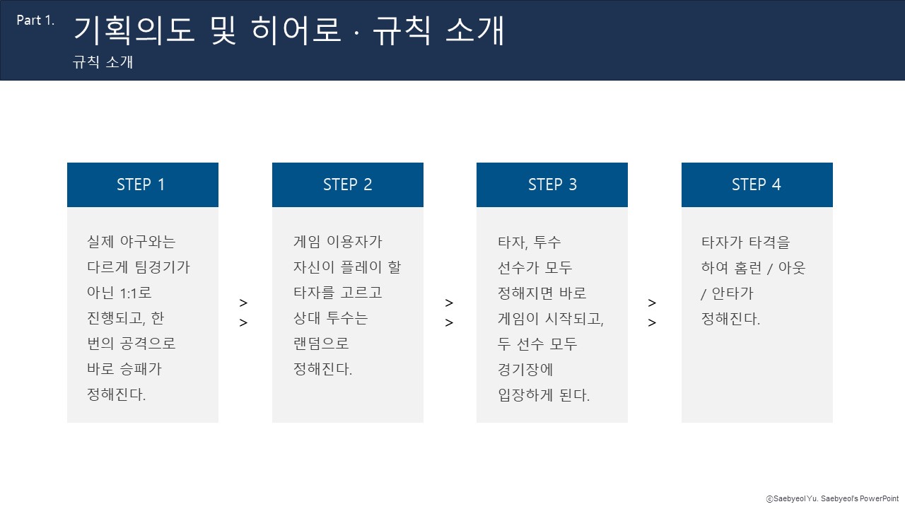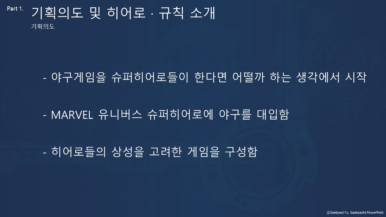 1) 목적: 야구 게임을 슈퍼히어로들이 하면 어떨까 하여 상성을 고려한 게임을 구성