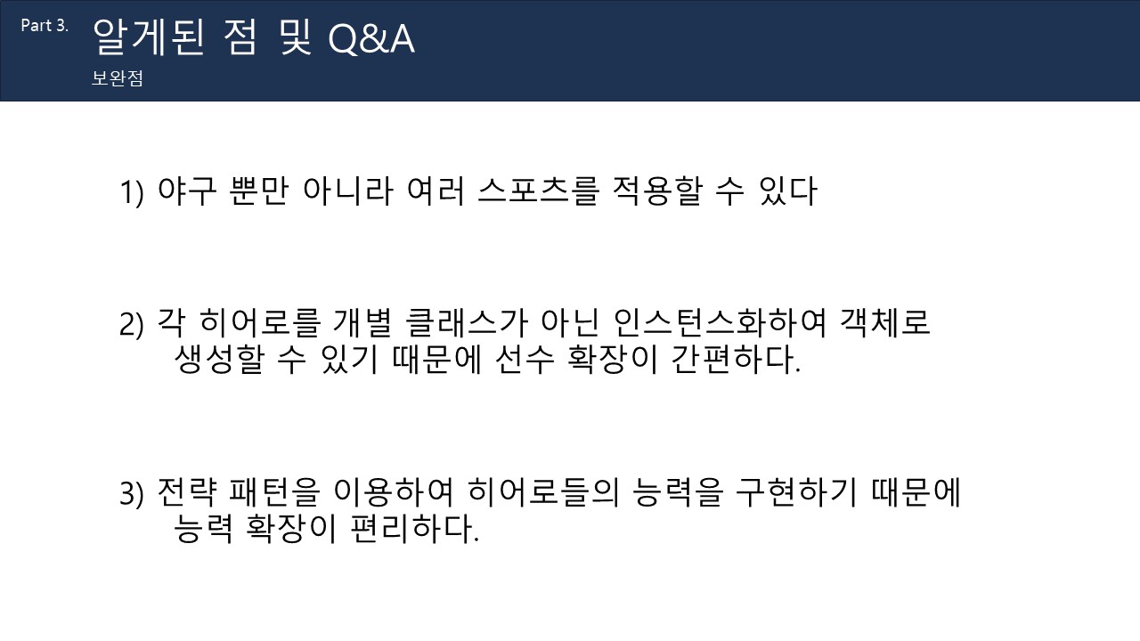 4) 결과: 각 히어로를 인스턴스화하여 객체로 생성할 수 있으며, 전략 패턴을 이용하여 확장을 편리하게 할 수 있음