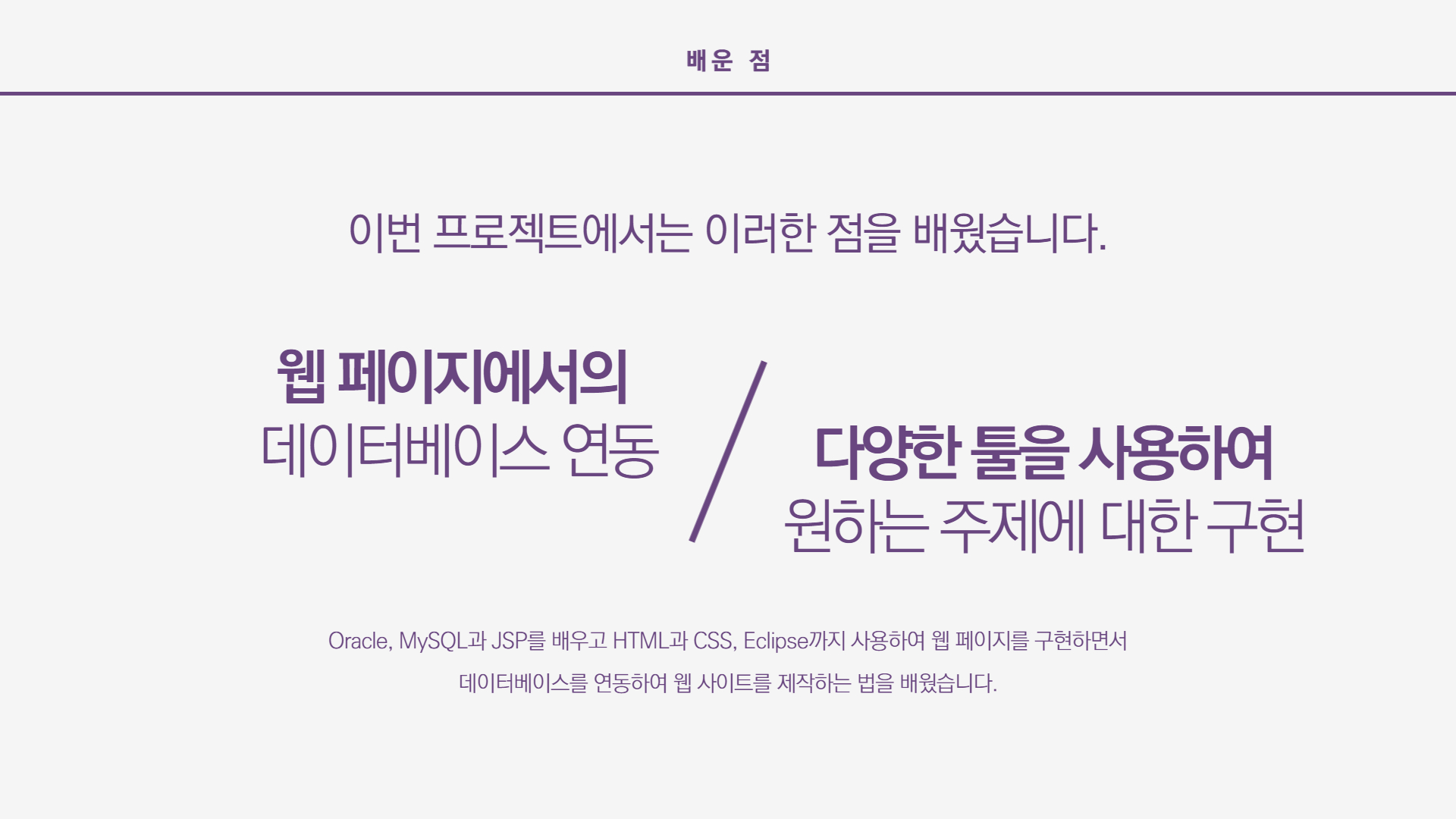 4) 결과: 웹 페이지에서의 데이터베이스 연동 수행, 다양한 툴을 사용하여 원하는 주제에 대한 프로젝트 구현