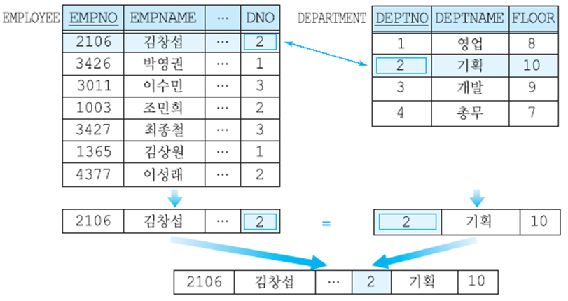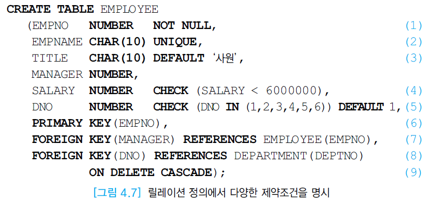 릴레이션 EMPLOYEE의 기본 키 EMPNO 애트리뷰트는 엔티티 무결정 제약조건에 의해 널값을 갖지 않아야 하므로 그림 4.7에서 NOT NULL을 명시해줬다. 릴레이션 DEPARTMENT의 기본 키 DEPTNO는 릴레이션 EMPLOYEE의 애트리뷰트 DNO와 조인할 때 참조 무결성 릴레이션에 의해 참조되는 애트리뷰트는 참조되는 릴레이션에서 동일한 데이터 타입을 가지면서 UNIQUE 또는 기본 키로 정의되어 있어야 하는 것 또한 그 예시가 될 수 있다.