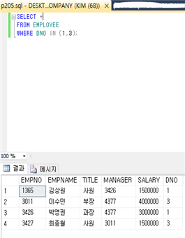 : 리스트 내의 값과 비교하는 IN 연산자가 있다. ‘WHERE DNO IN (1, 3)’는 DNO의 값이 1이나 3에 속하는가를 검사한다. IN의 부정으로 사용하려 하면 NOT IN을 사용하면 되고, IN을 사용하면 다수의 OR을 사용할 필요 없이 OR와 동일한 결과를 확인할 수 있다. 아래 예제는 “1번 부서나 3번 부서에 소속된 사원들에 관한 모든 정보를 검색하라”는 질의에 대한 결과이다.