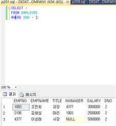 : 사용자가 원하지 않는 투플들을 배제하기 위해서 부정 연산자 <>를 사용하기도 한다. 아래 예제는 “직급이 과장이면서 1번 부서에 속하지 않은 사원들의 이름과 급여를 검색하라”는 질의에 대한 결과이다.