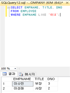 : LIKE 비교 연산자는 문자열의 일부에 대해서 비교 조건을 명시한다. 이 때 wild 문자 ‘%’는 0개 이상의 문자열과 대치되고, wild 문자 ‘_’는 임의의 한 개의 문자와 대치된다. 예를 들어 LIKE ‘S%’는 첫 문자가 S이고 그 다음에는 0개 이상 임의의 문자열이 올 수 있고, LIKE ‘S___’는 첫 문자가 S이고 그 다음에는 정확히 3개의 문자가 올 수 있는 방식이다. 이는 뒷부분, 앞부분, 중간부분 어디든 사용할 수 있다. 다만, wild 문자가 문자열의 앞부분에 사용되면 조건에 맞는 투플들을 검색하기 위해서 인덱스를 사용하지 못하며, 모든 투플들을 하나씩 읽어야 하기 때문에 수행 시간이 오래 걸릴 수 있다. 다음 예제는 “이씨 성을 가진 사원들의 이름, 직급, 부서번호를 검색하라”는 질의에 대한 결과이다.