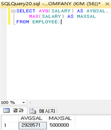 : 집단 함수란 데이터베이스에서 검색된 열 투플들의 집단에 적용되는 함수이다. 각 집단 함수는 할 릴레이션의 한 개의 애트리뷰트에 적용되어 단일 값을 반환한다. 집단 함수는 SELECT절과 HAVING절에만 명시할 수 있다. 집단 함수에는 개수를 세는 COUNT, 값들의 합을 나타내는 SUM, 평균 AVG, 최댓값 MAX, 최솟값 MIN 등이 있다. COUNT와 MIN, MAX는 숫자형 애트리뷰트와 비 숫자형 애트리뷰트 모두에 적용할 수 있지만, SUM과 AVG는 숫자형 애트리뷰트에만 적용할 수 있다. COUNT(*)를 제외한 모든 함수들은 NULL값을 제거한 후 남아있는 값들에 대하여 값을 구한다. 다음 예제는 “모든 사원들의 평균 급여와 최대 급여를 검색하라”는 질의에 대한 결과이다.