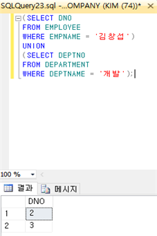 : 집합 연산을 적용하려면 두 릴레이션이 합집합(UNION ALL) 호환성을 가져야 한다. 첫 번째 질의의 애트리뷰트 이름들이 결과에 나타나는데, UNION ALL을 제외하고 결과가 오름차순으로 정렬된다. UNION ALL을 제외한 모든 집합 연산의 결과 릴레이션에서 중복된 투플들이 자동적으로 삭제된다. 다음 예제는 “김창섭이 속한 부서이거나 개발 부서의 부서번호를 검색하라”는 질의에 대한 결과이다.